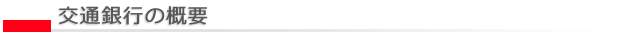 当行は1908年に中国で設立された100年を超える歴史を持つ銀行です。海運、陸運、電力、郵政などの各産業の資金需要に応じる専門銀行であると同時に、通常の銀行業務も取り扱う銀行として業務を開始し今日まで発展してきました。設立当初は旧中国(1949年の解放前)の発券銀行でもあり、中央銀行、中国銀行、中国農業銀行とともに四大銀行として中国銀行業界の発展に貢献してきました。当時から外国銀行の先進的な制度、業務ノウハウを積極的に導入し、中国資本の銀行の中では中国銀行に次いで2番目に国外に支店を設立した銀行でもあります。