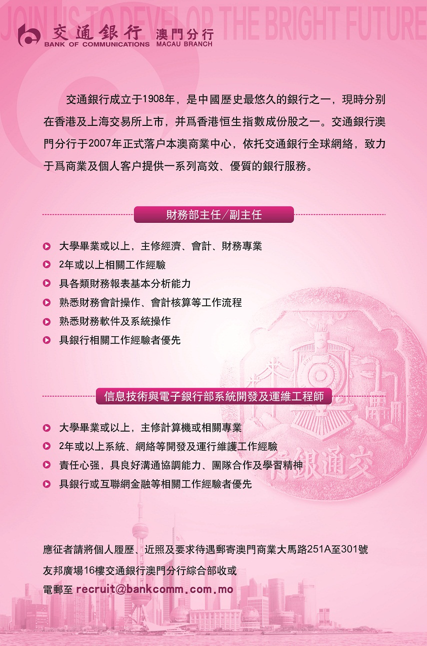 應徵方法:請將個人履歷、近照及要求待遇郵寄交通銀行澳門分行綜合部或電郵至;recruit@bankcomm.com.mo。