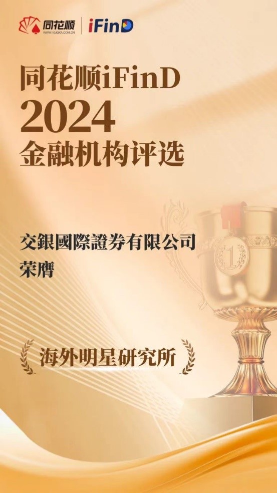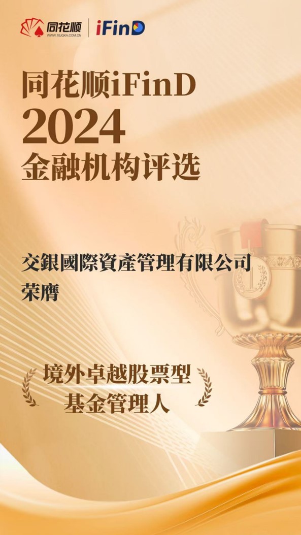 2024年同花順iFinD金融機構評選結果於近日揭曉。交銀國際憑藉卓越的投研能力和專業水準,獲評年度“境外卓越股票型基金管理人”、“海外明星研究所”獎項,彰顯了市場及投資者對交銀國際的高度認可。 |